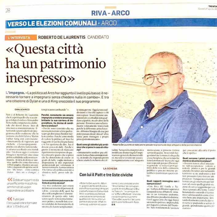 Mi chiamo Roberto De Laurentis, sono nato ad Arco dove vivo con mia moglie Annamaria e due bovari del Bernese, Ra e Shai. Ottenuta la maturità classica e abbandonata la facoltà di medicina e chirurgia, ho lavorato in Aquafil prima come operaio, poi come programmatore di computer, infine come responsabile dei sistemi di elaborazione-dati. Lasciata l’azienda, per trascorrere due anni nel gruppo Arcese a realizzarne il sistema informatico, nel 1982 ho fondato SIMA che oggi occupa oltre quaranta dipendenti, si colloca ai vertici tecnologici non solo italiani, è operativa nel territorio nazionale e in molti paesi europei. Nel 2018 SIMA è stata acquisita da Zucchetti, multinazionale italiana dell’informatica. Oggi sono imprenditore nel settore della grafica e comunicazione.